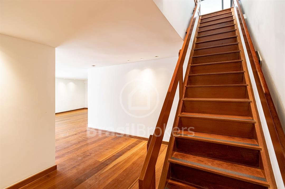 Subindo a elegante escada de madeira reta, encontre piscina, sauna com dois banheiros e dois chuveiros separados, área gourmet, amplo salão, mais um quarto, dois banheiros, dois chuveiros, bancada com duas cubas e um closet