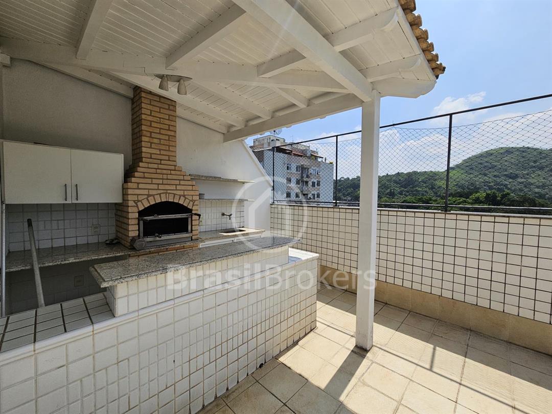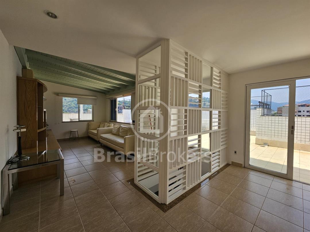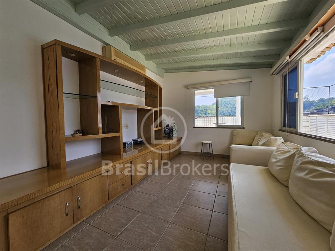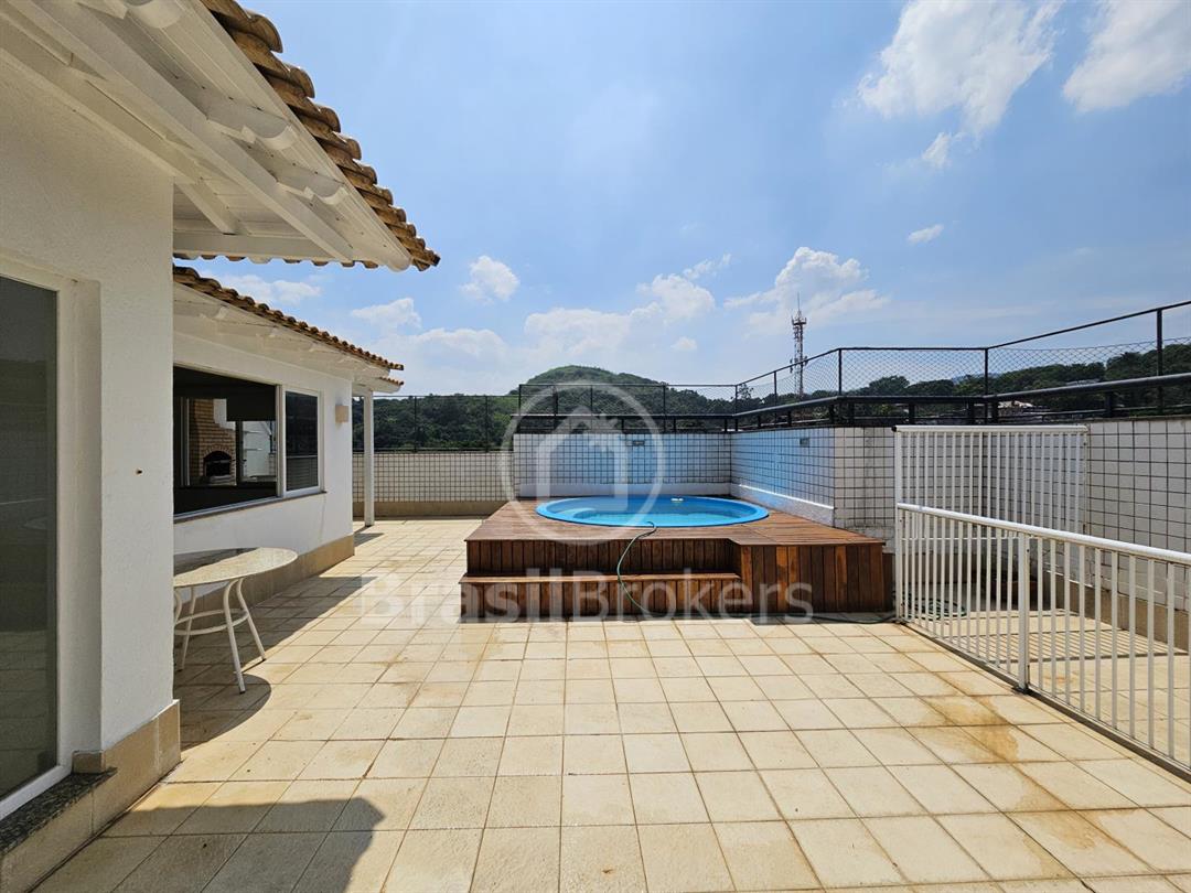 Cobertura duplex numa das ruas mais procuradas do bairro Freguesia. Primeiro pavimento; sala ampla em 2 ambientes com saída para varandão, luz indireta, gesso, sol da manhã, vista livre, cozinha com armários embutidos, piso porcelanato, dependência completa e armários em porcelanato, banheiro social, box, armários, hall