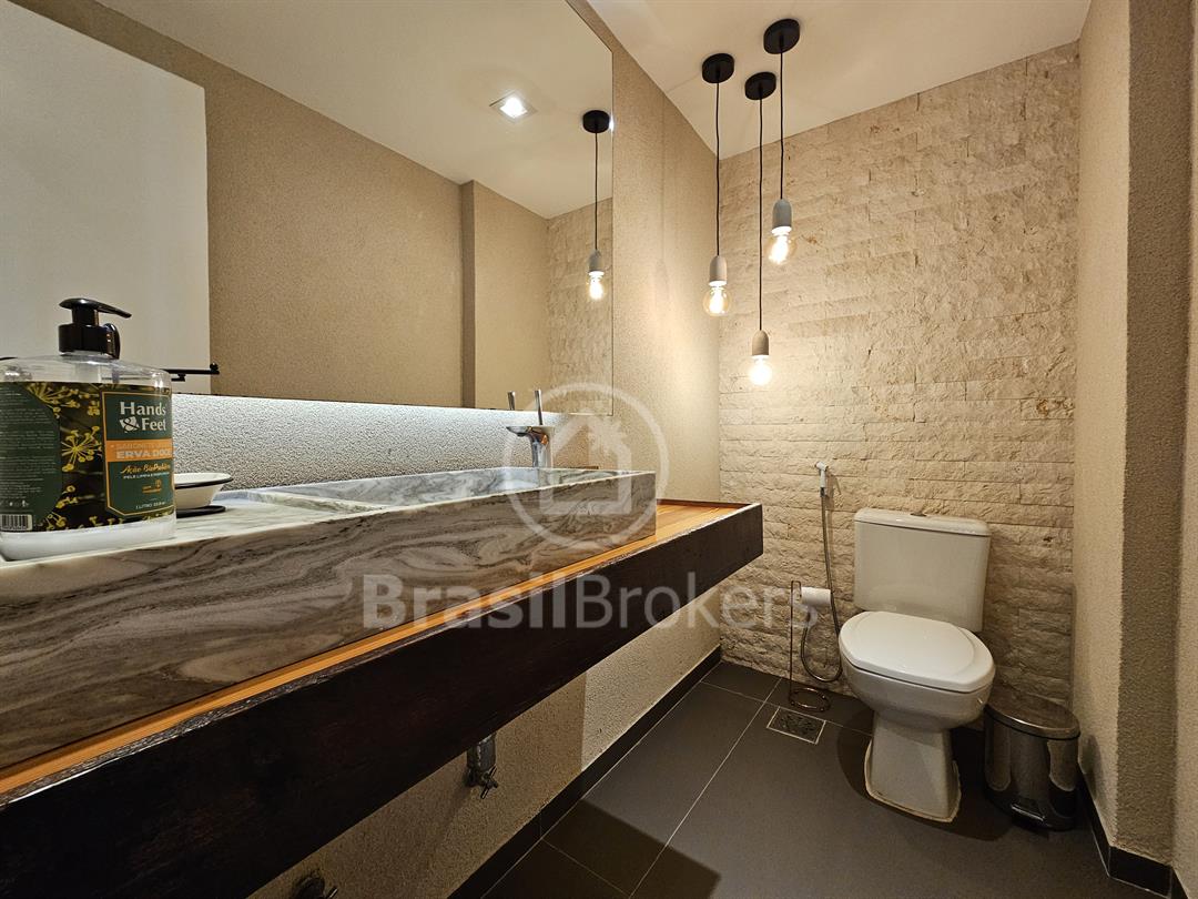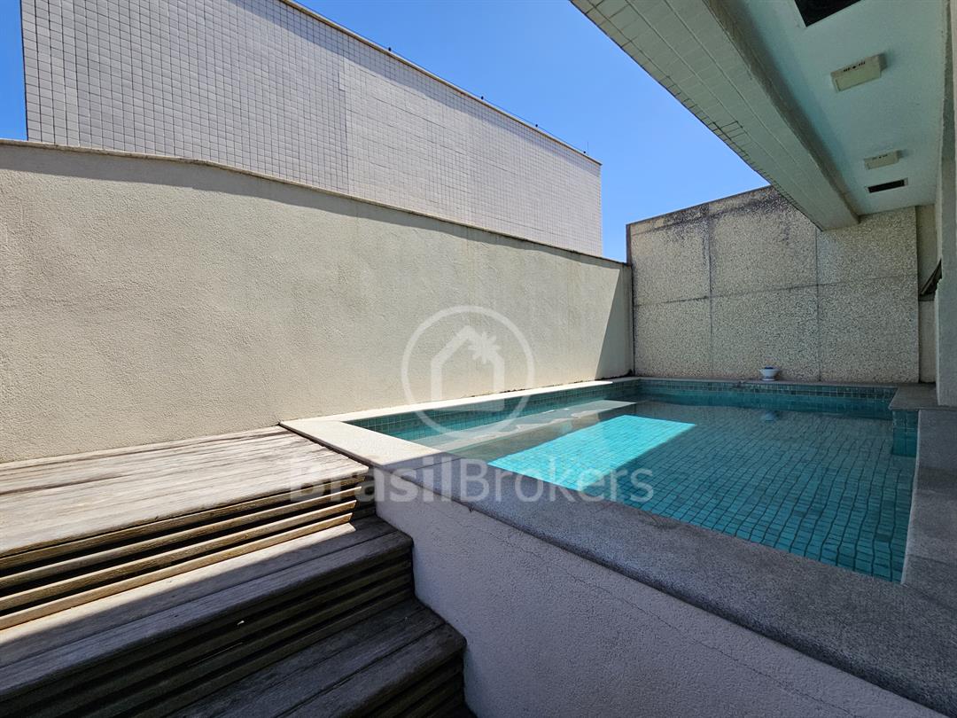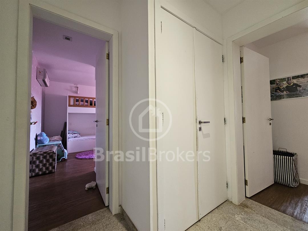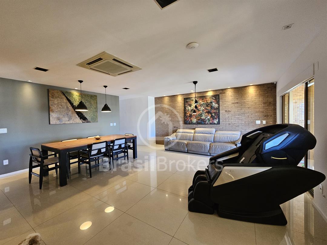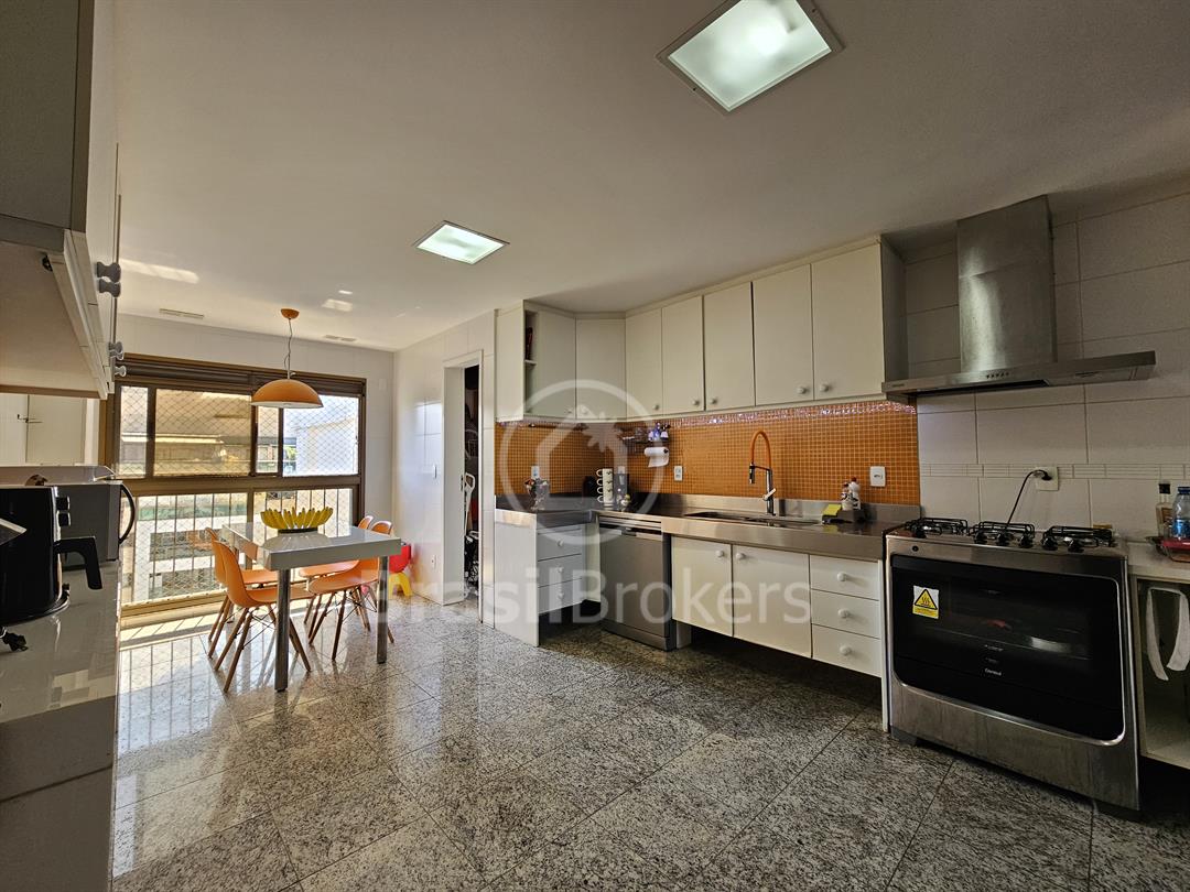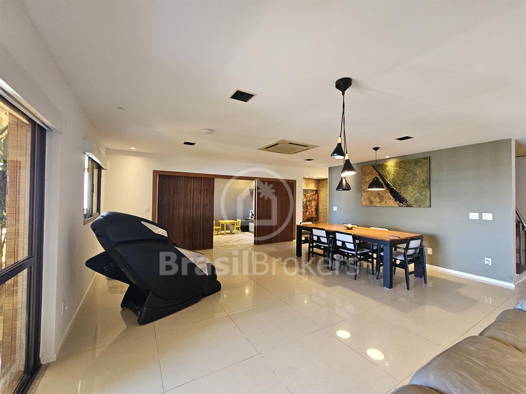 A cozinha, espaçosa e funcional, conta com despensa e banheiro de serviço. No segundo piso, a área de lazer é completa, com piscina, churrasqueira e banheiro externo, garantindo praticidade e conforto, além de duas suítes generosas com vistas totalmente livres. Localizado no exclusivo Condomínio Península Evidence, na Barra da Tijuca, este imóvel oferece segurança 24h, estrutura de lazer completa e uma localização privilegiada