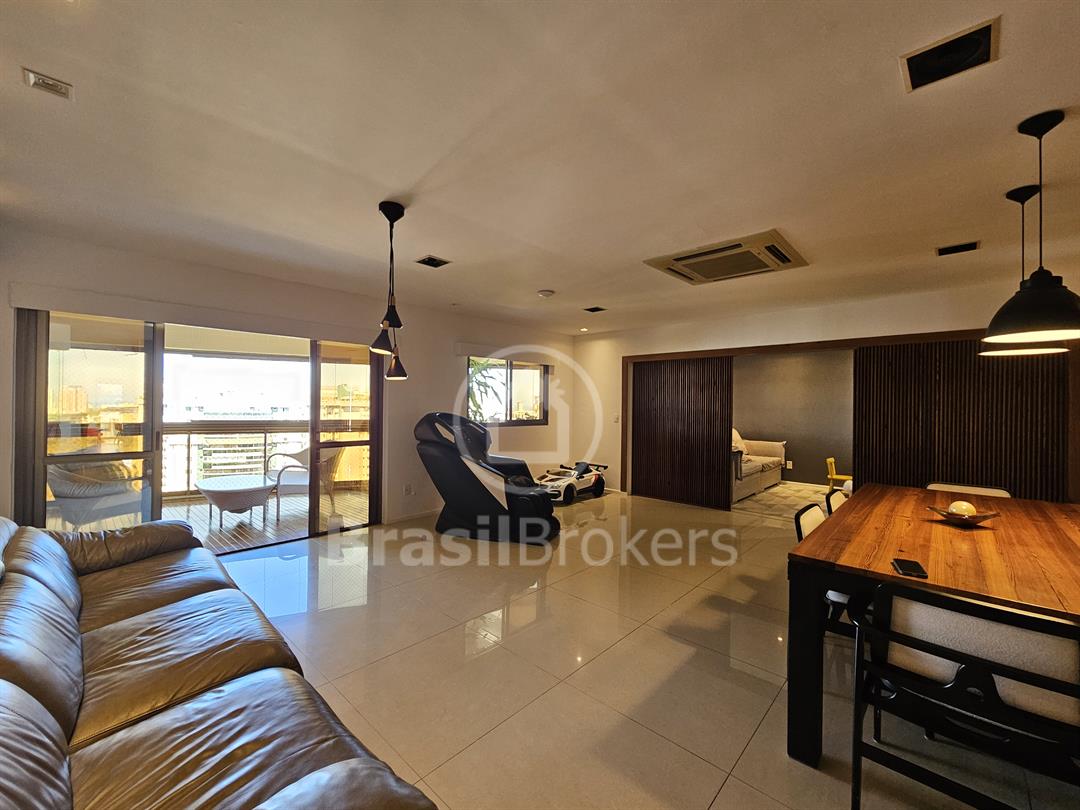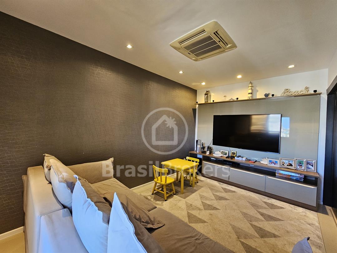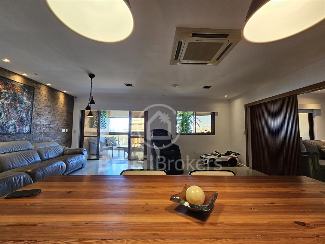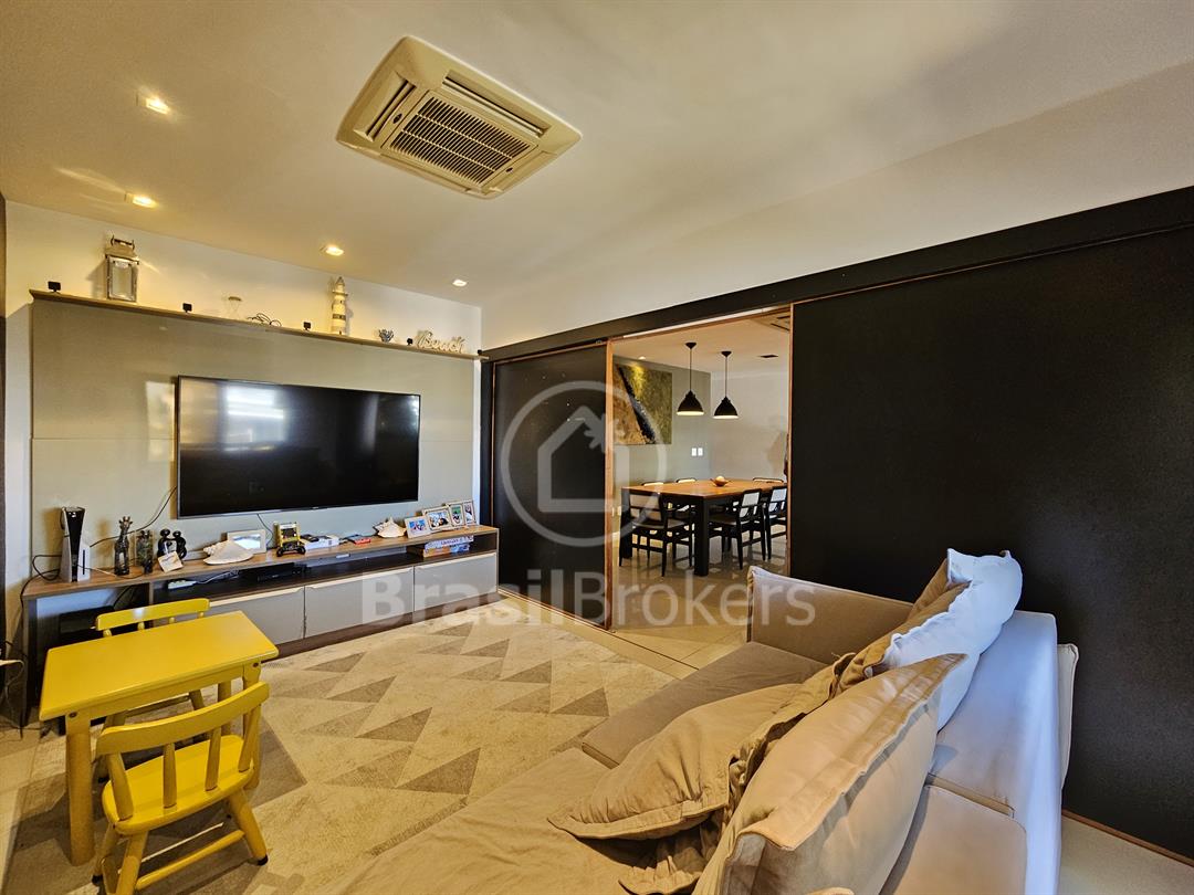 A sala principal, ampla e climatizada, comporta diversos ambientes, incluindo sala de TV e lavabo com acabamento de altíssimo padrão