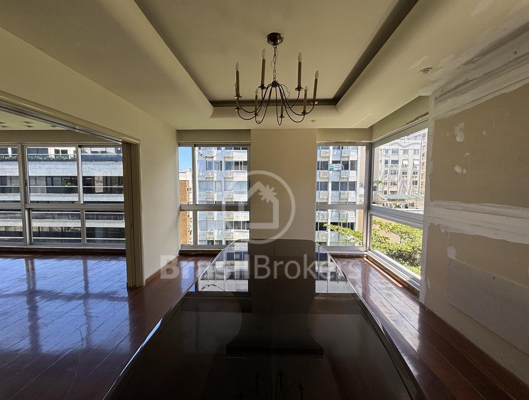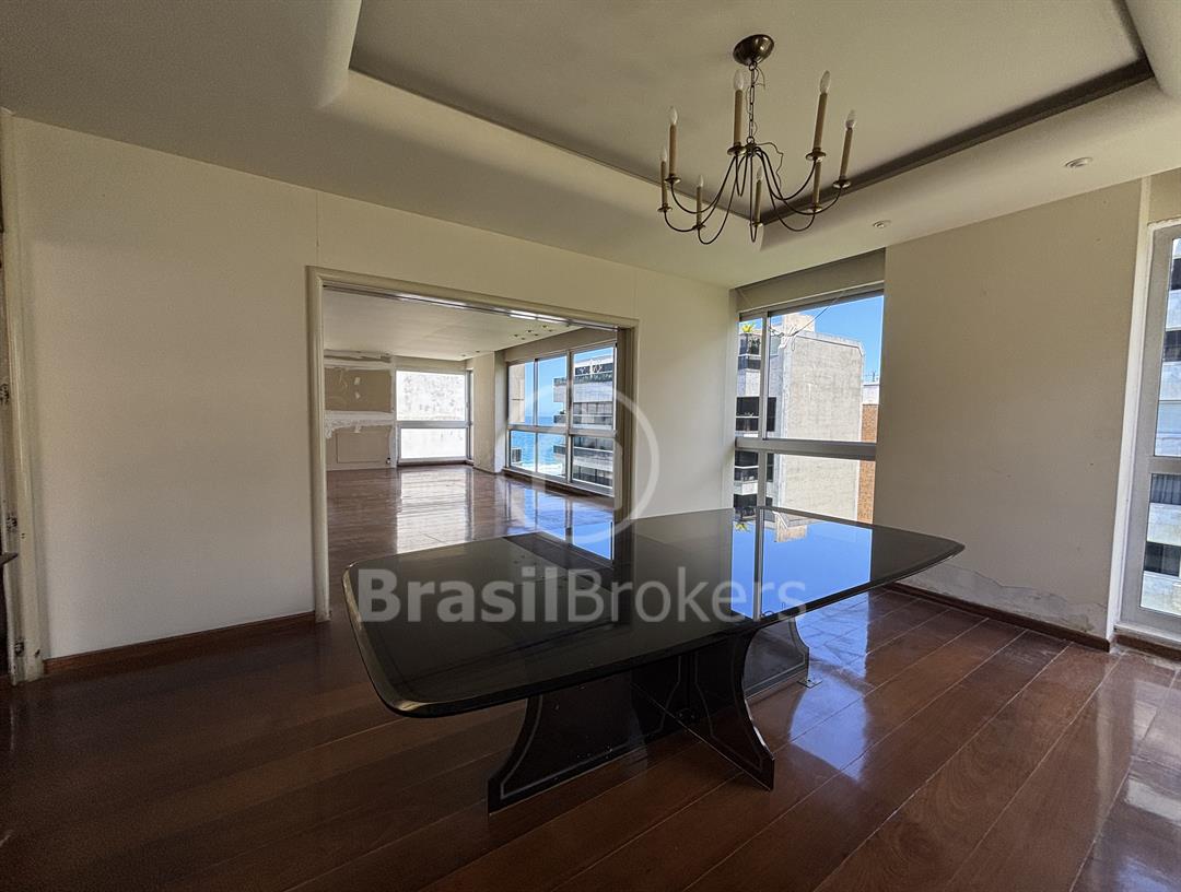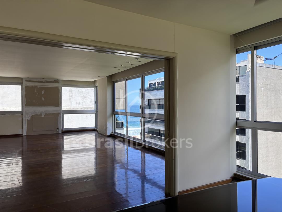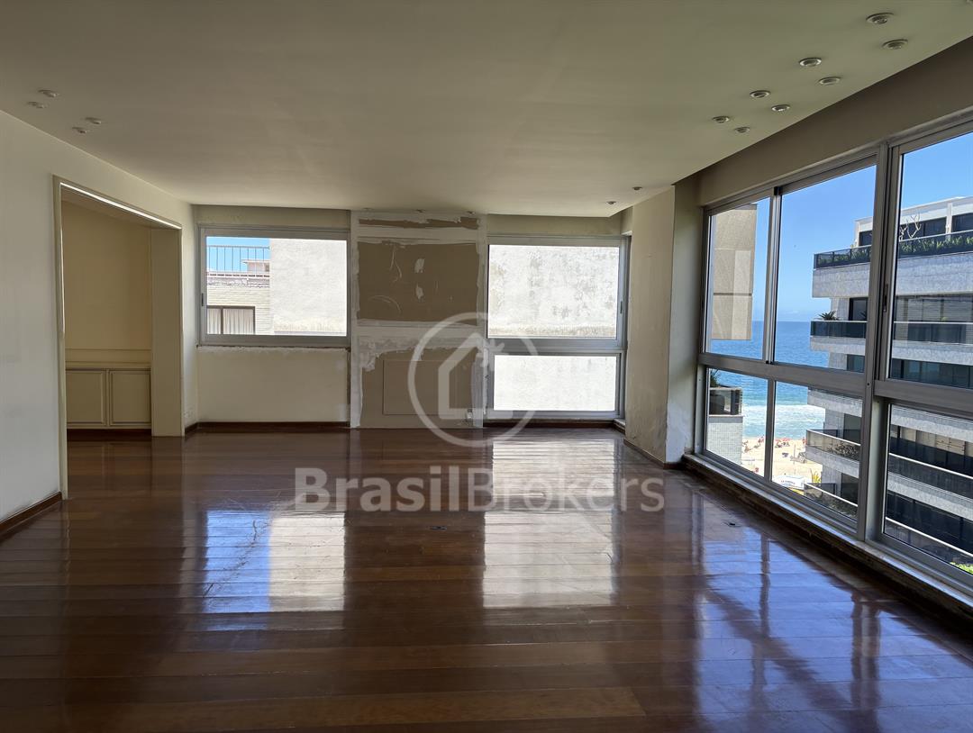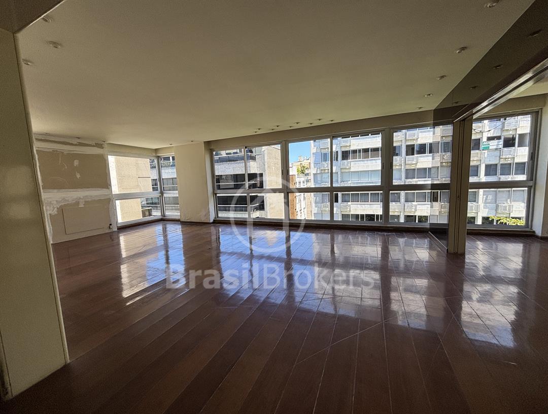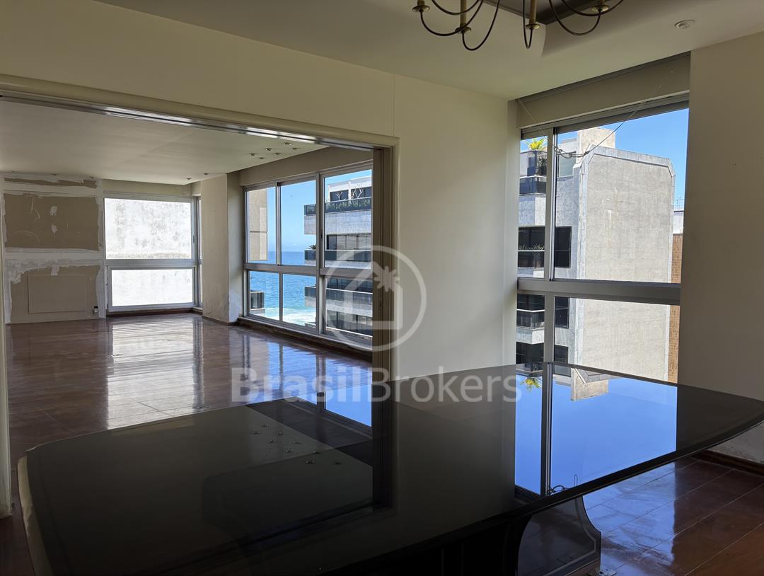 Apartamento na 1ª quadra do Leblon, 226 m², original 4 quartos, atualmente com 3 quartos com fácil reversão para o 4º quarto, sendo 1 suíte (com 1 closet), com possibilidade de fazer novas suítes, podendo também fazer integração da sala com a cozinha, piso em madeira lindíssima em Ipê rosa, andar alto, planta circular, claro e arejado, pé direito alto (3 m), vista lateral da praia do Leblon, estrutura centro de terreno, excelente iluminação com o sol da manhã na lateral da sala e nos quartos, e um sol da tarde na outra lateral da sala, instalações elétricas e hidráulicas renovadas, sala ampla em 3 ambientes (incluindo living), todos os cômodos possuem armários de madeira maciça nobre, 2 dependências completas, área de serviço com armários, corredor de acesso aos cômodos com armários (louceiro/rouparia), cozinha ampla, uma despensa grande para louças e utensílios, 3 vagas escrituradas