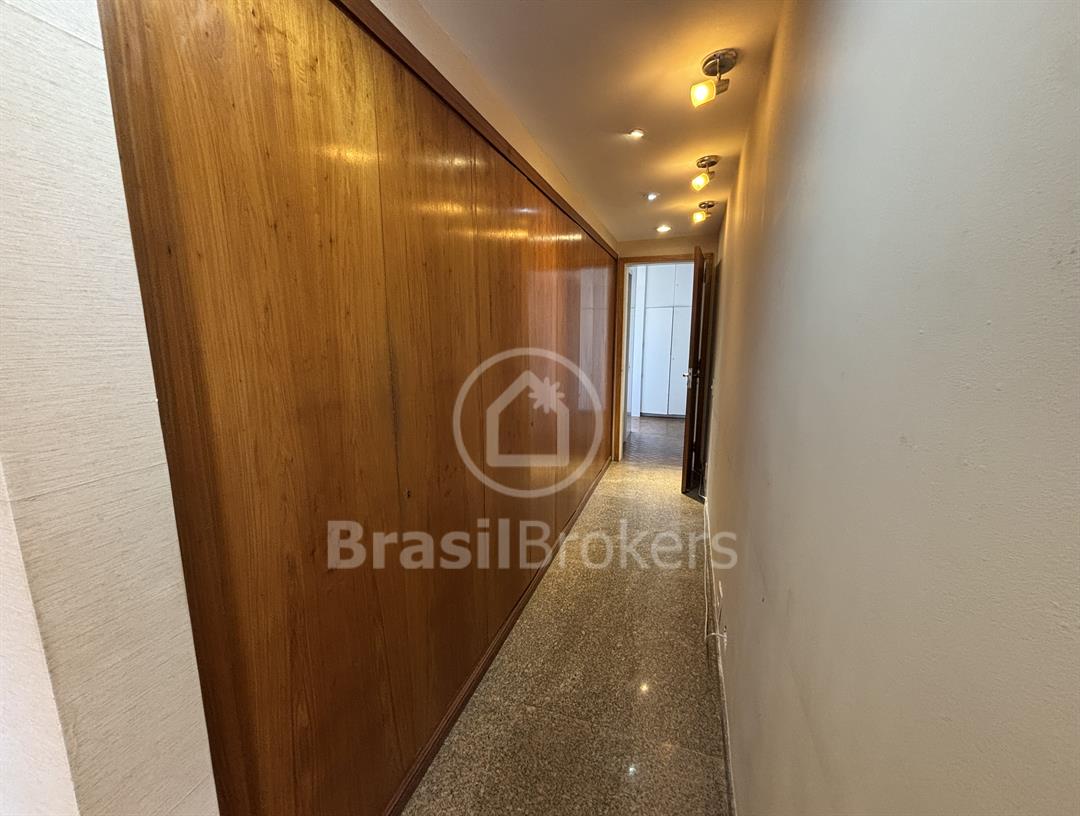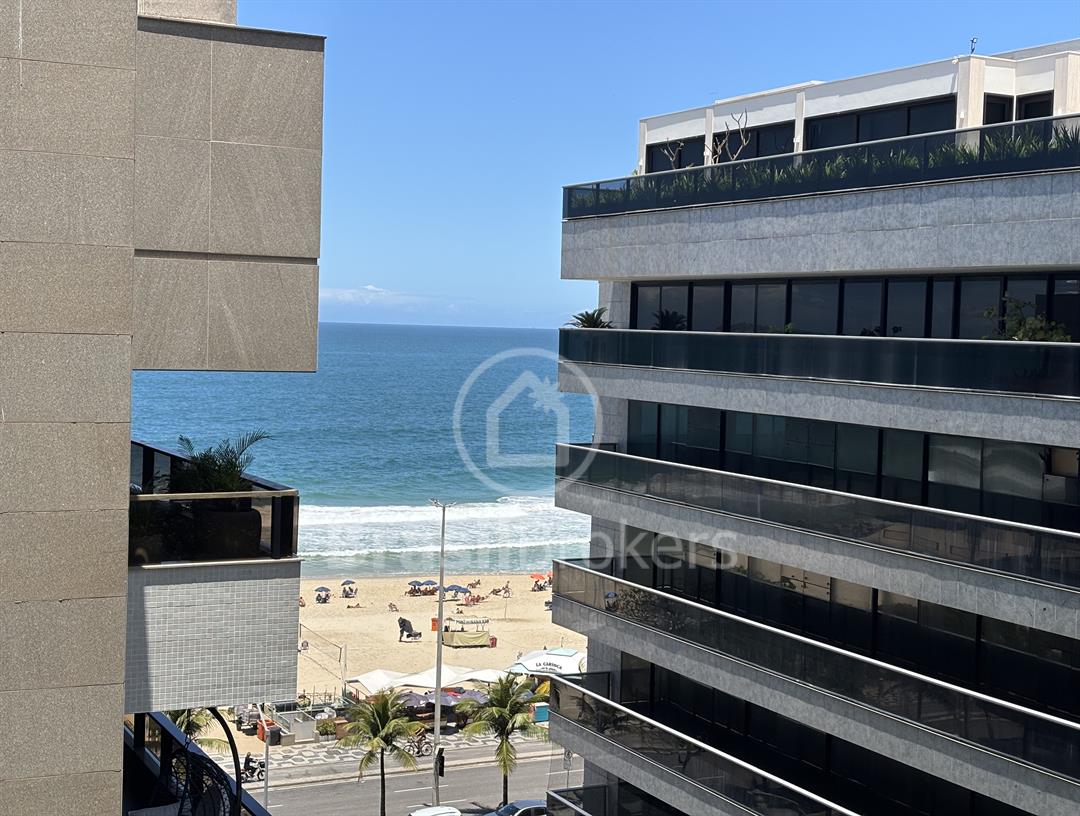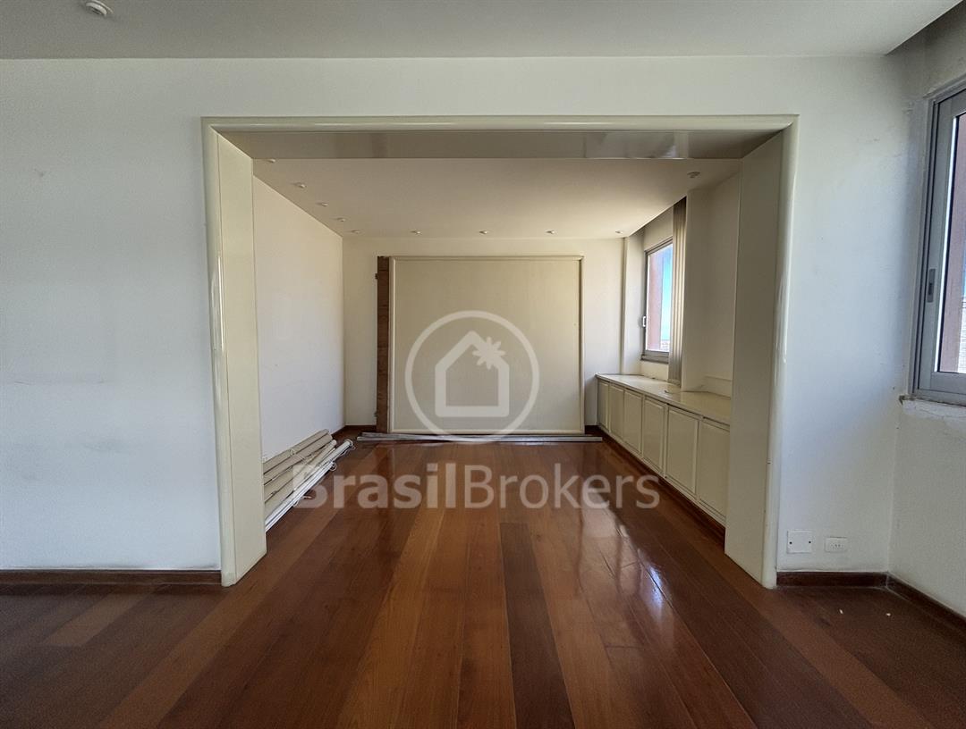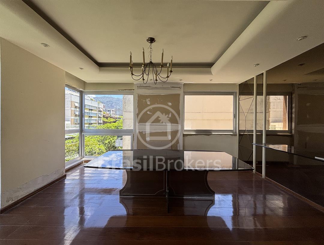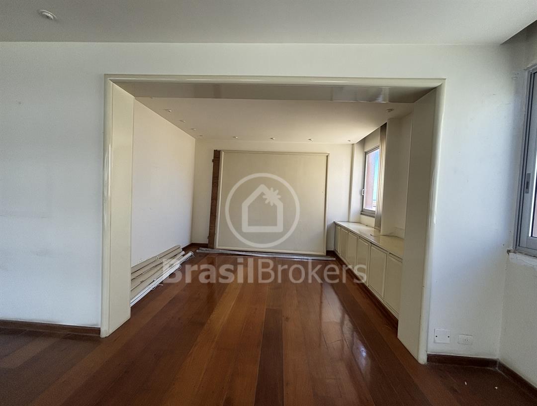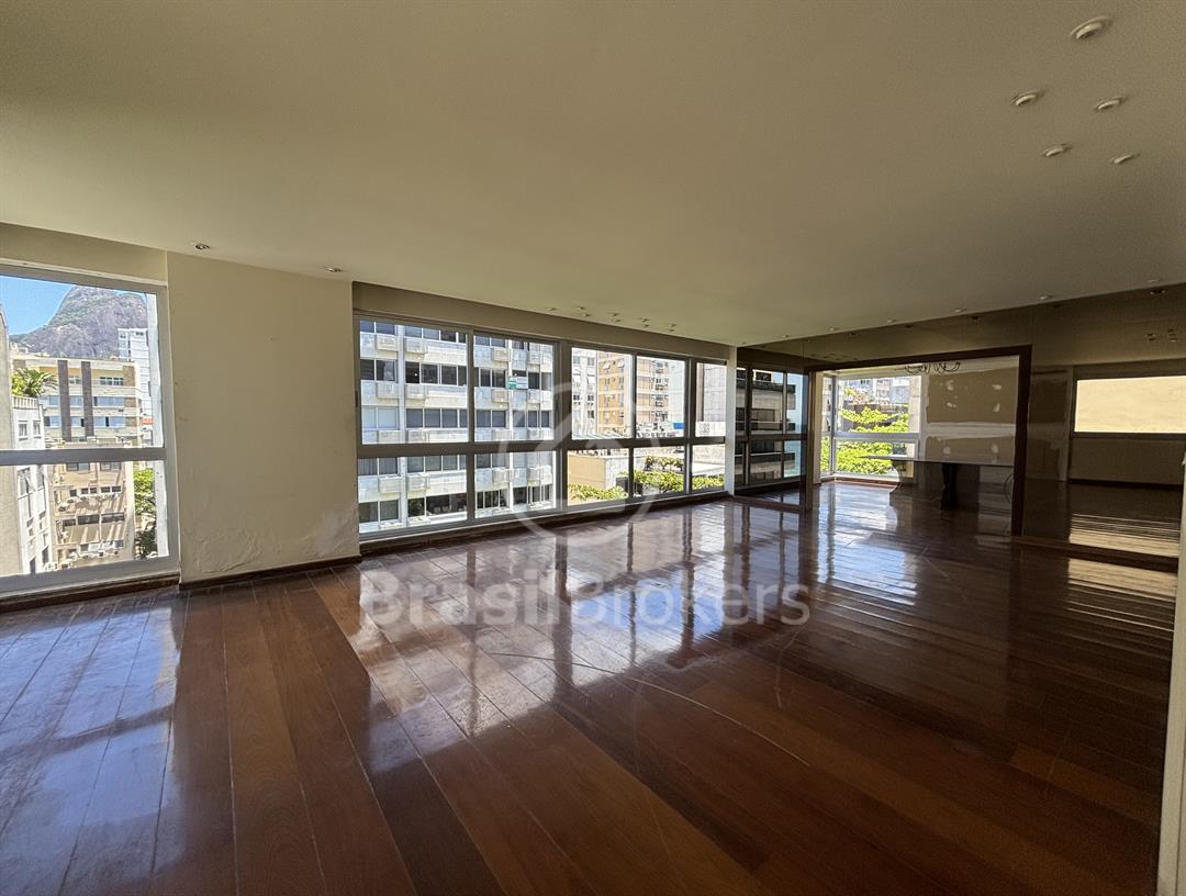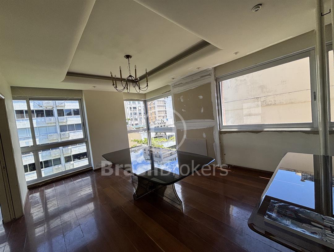 Apartamento na 1ª quadra do Leblon, 226 m², original 4 quartos, atualmente com 3 quartos com fácil reversão para o 4º quarto, sendo 1 suíte (com 1 closet), com possibilidade de fazer novas suítes, podendo também fazer integração da sala com a cozinha, piso em madeira lindíssima em Ipê rosa, andar alto, planta circular, claro e arejado, pé direito alto (3 m), vista lateral da praia do Leblon, estrutura centro de terreno, excelente iluminação com o sol da manhã na lateral da sala e nos quartos, e um sol da tarde na outra lateral da sala, instalações elétricas e hidráulicas renovadas, sala ampla em 3 ambientes (incluindo living), todos os cômodos possuem armários de madeira maciça nobre, 2 dependências completas, área de serviço com armários, corredor de acesso aos cômodos com armários (louceiro/rouparia), cozinha ampla, uma despensa grande para louças e utensílios, 3 vagas escrituradas