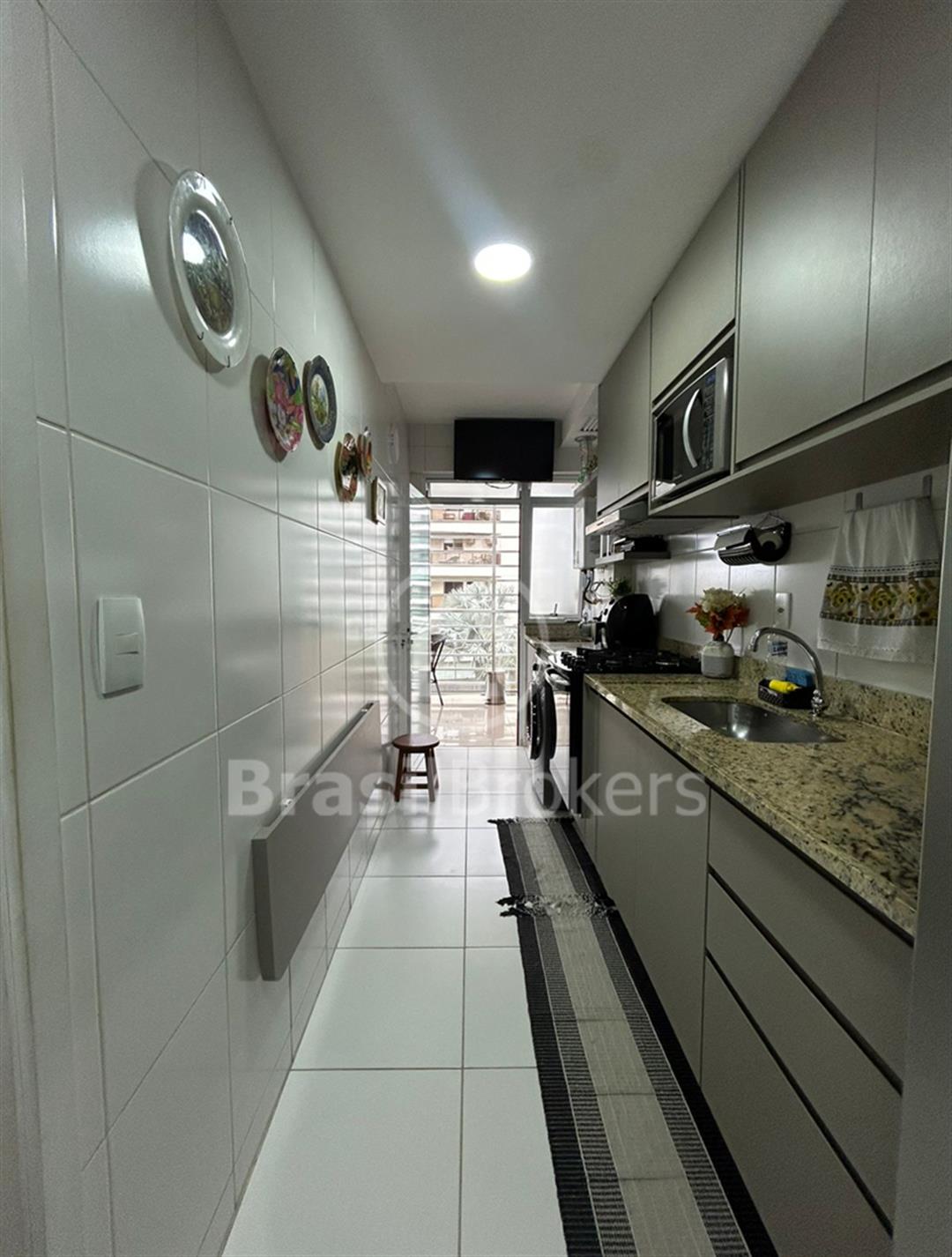 A cozinha planejada com bancada em granito e o banheiro social com armários e espelhos oferecem praticidade e sofisticação