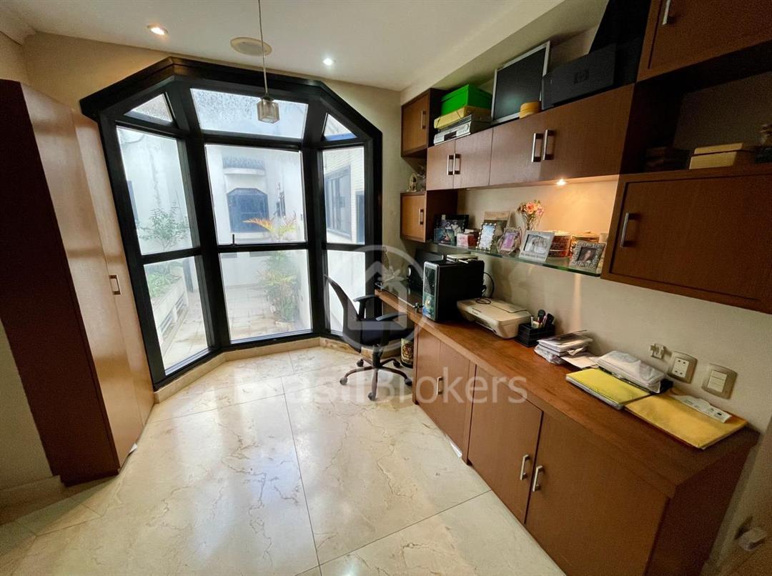 O hall interno, transformado em um elegante escritório, oferece vista para o tranquilo jardim do condomínio