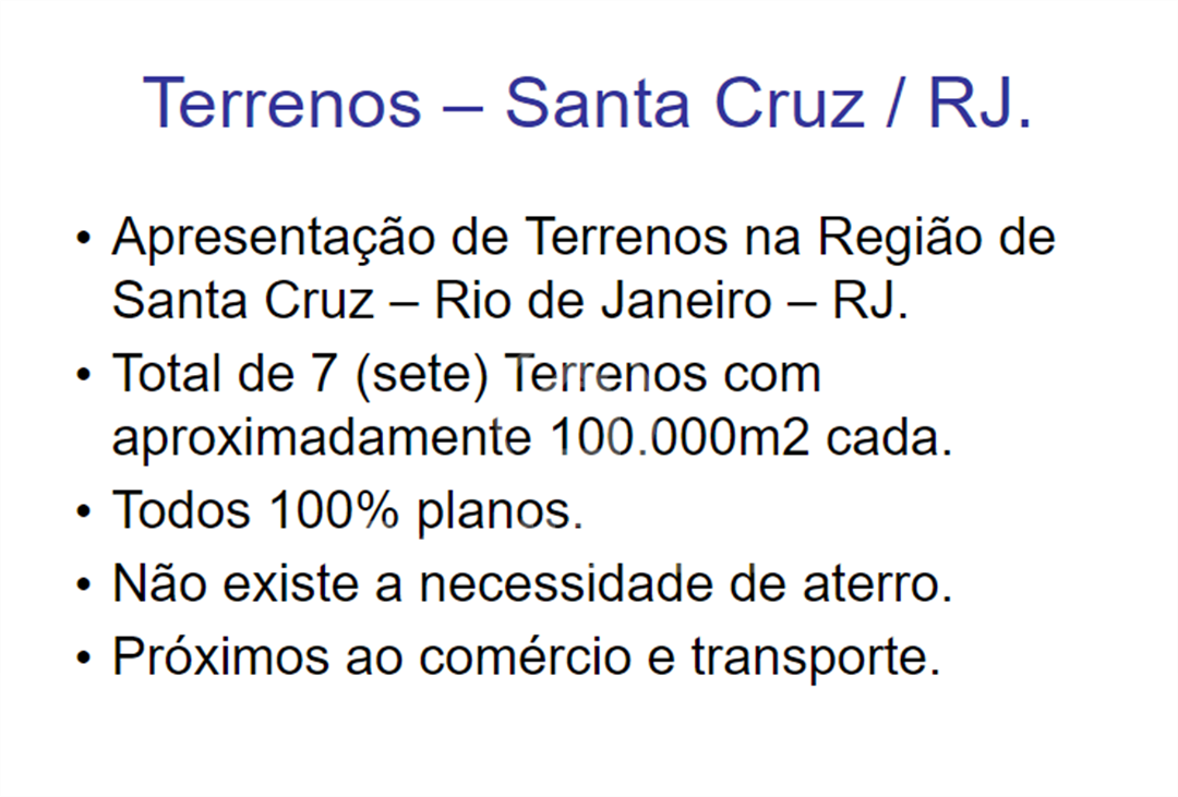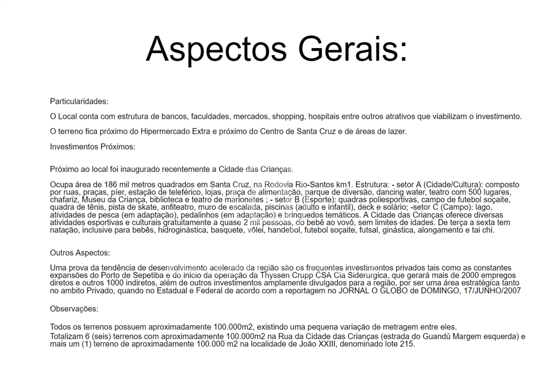 Totalizam 6 (seis) terrenos com aproximadamente 100.000m² cada, na Rua da Cidade das Crianças (estrada do Guandú Margem esquerda) e mais um (1) terreno de aproximadamente 100.000 m² na localidade de João XXIII, denominado lote 215